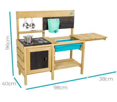 A Deluxe fa sárkonyha a stílus és a funkcionalitás ötvözete, amelyet kifejezetten a természetközeli, kreatív játékhoz terveztek. Ez a robusztus konyha nem csupán egy játék, hanem egy komplett kulináris központ az udvaron, ahol a gyerekek felfedezhetik a sütés-főzés örömeit.