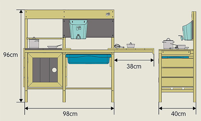 • Valódi vizes élmények: A nagy, masszív mosogató és az újratölthető csap segítségével a gyerekek könnyedén vizet használhatnak a sárdagasztáshoz vagy az edények elmosásához.